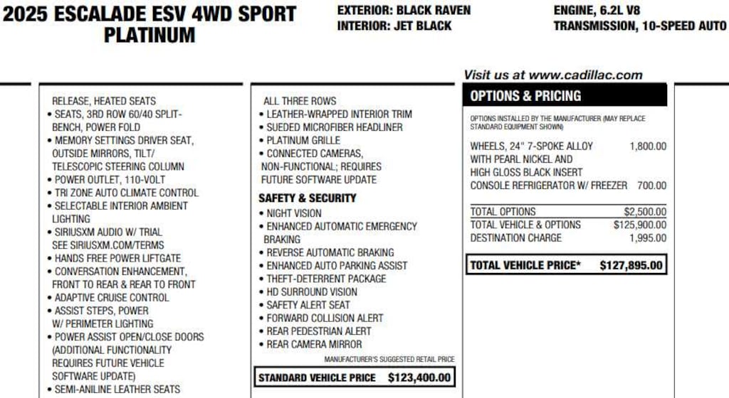Leather Seats, Third Row Seat, Navigation, DVD, Sunroof, Panoramic Roof, 4x4, Quad Bucket Seats, Power Liftgate, Heated Driver Seat, Cooled Driver Seat, Back-Up Camera, Running Boards, Premium Sound System, Satellite Radio MP3 Player, Keyless Entry, Privacy Glass, Remote Trunk Release, Steering Wheel Controls. Cadillac 4WD Sport Platinum with Black Raven exterior and Jet Black interior features a 8 Cylinder Engine with 420 HP at 5600 RPM*. CARFAX 1-Owner AutoCheck One Owner 172-Point Vehicle Inspection, including road test performed by trained Cadillac technicians, 1 year-unlimited mile Limited Warranty upon expiration of the New Vehicle Limited Warranty, $0 Deductible, All scheduled maintenance performed and up to date, Can be serviced at any Cadillac dealer nationwide, Digitally equipped vehicles are eligible for 3 trial months of OnStar Directions and Connections, 24-Hour Roadside Assistance with Courtesy Transportation, Satellite radio-equipped vehicles include a 3-month trial to SiriusXM All Access package Was $125,998.