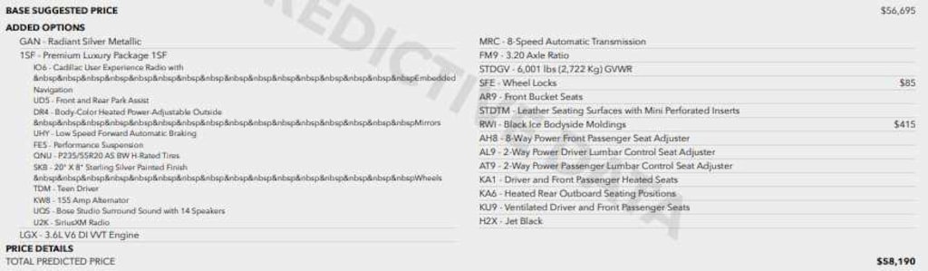 CADILLAC USER EXPERIENCE WITH EMBEDDED NAVIGATION, AM/FM STEREO with 8" diagonal color information display, four USB ports, two auxiliary power outlets, auxiliary input jack, Natural Voice Recognition, Phone Integration for Apple CarPlay® and Android Auto® capability for compatible phone, Connected Apps and Teen Driver (STD), ENGINE, 3.6L V6, DI, VVT, WITH AUTOMATIC STOP/START (310 hp [231 kW] @ 6600 rpm, 271 lb-ft of torque [366 N-m] @ 5000 rpm) (STD), TRANSMISSION, 8-SPEED AUTOMATIC (STD).