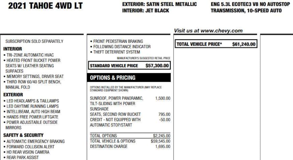 SUNROOF, POWER PANORAMIC, DUAL-PANE, TILT-SLIDING with express-open and close and power sunshade, SEATS, SECOND ROW BUCKET, MANUAL, AUDIO SYSTEM, CHEVROLET INFOTAINMENT 3 PLUS SYSTEM, 10.2" DIAGONAL HD COLOR TOUCHSCREEN AM/FM stereo, Bluetooth® audio streaming for 2 active devices, Apple CarPlay® and Android Auto® capable, enhanced voice recognition, in-vehicle apps, cloud connected personalization for select infotainment and vehicle settings. Subscription required for enhanced and connected services after trial period. (STD), ENGINE, 5.3L ECOTEC3 V8 with Dynamic Fuel Management, Direct Injection and Variable Valve Timing, includes aluminum block construction (355 hp [265 kW] @ 5600 rpm, 383 lb-ft of torque [518 Nm] @ 4100 rpm) (STD), TRANSMISSION, 10-SPEED AUTOMATIC electronically controlled with overdrive, includes Traction Select System including tow/haul (Most vehicles built on or after 6-7-2021 with a V8 engine will have (NSS) Not Equipped with Automatic Stop/Start, which removes Automatic Stop/Start, Engine control stop/start disable button and its content.) (STD).