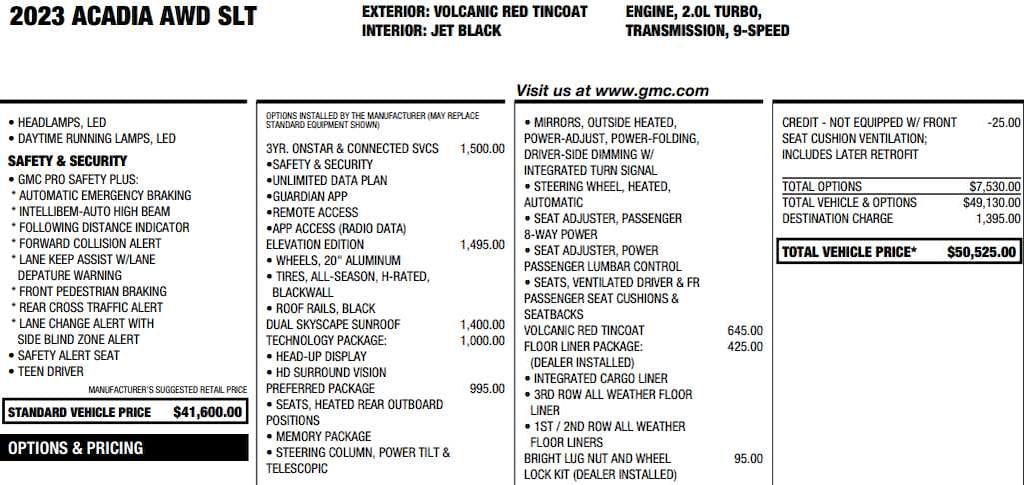ELEVATION EDITION includes Black grille and exterior accents, (QGY) 20" aluminum wheels, Black center caps, (QNU) 20" all-season blackwall tires and (V59) Gloss Black roof rails, SUNROOF, DUAL SKYSCAPE 2-PANEL POWER with tilt-sliding front and fixed rear with sunscreen, TECHNOLOGY PACKAGE includes (UV2) HD Surround Vision and (UV6) Head Up Display, LPO, FLOOR LINER PACKAGE includes (RIA) front and second row all-weather floor liner, LPO, (RIB) third row all-weather floor liner, LPO and (CAV) integrated cargo liner, LPO, AUDIO SYSTEM, 8" DIAGONAL GMC INFOTAINMENT SYSTEM WITH NAVIGATION includes multi-touch display, AM/FM/SiriusXM stereo, Bluetooth® streaming audio for music and most phones, Android Auto® and Apple CarPlay® capability for compatible phones, advanced voice recognition, in-vehicle apps, personalized profiles for infotainment and vehicle settings (STD), ENGINE, 2.0L TURBO, 4-CYLINDER, SIDI with Variable Valve Timing (VVT) (228 hp [171 kW] @ 5000 rpm, 258 lb-ft of torque [349.8 N-m]) @ 1500 - 4000 rpm (STD), TRANSMISSION, 9-SPEED AUTOMATIC, ELECTRONICALLY-CONTROLLED with 2.0L Turbo engine (STD), LUXURY PACKAGE includes (AAB) Memory Package for power driver seat and outside mirrors, (A7K) 8-way power front passenger seat adjuster, (DYX) outside heated power-adjustable power-folding body-color mirrors with driver-side auto-dimming with integrated turn signal indicators, (AT9) power passenger lumbar control, (KU9) heated and ventilated driver and front passenger seats, (KA6) heated rear outboard seats and (N38) power tilt and telescopic steering column.