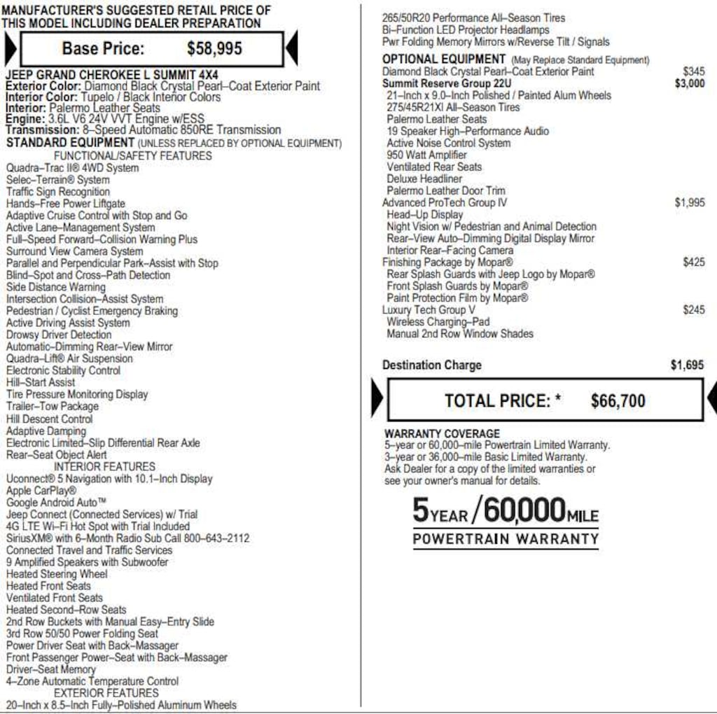 Engine: 3.6L V6 24V VVT UPG I w/ESS, Transmission: 8-Speed Automatic (850RE), Deluxe Headliner, Trailer Tow Package, Trailer Hitch Zoom, Class IV Receiver Hitch, 7 & 4 Pin Wiring Harness, Palermo Leather Door Trim, 950 Watt Amplifier, Summit Reserve Badge, Ventilated Rear Seats, Summit Reserve, Interior Rear Facing Camera, Head Up Display, Rearview Autodim Digital Display Mirror, Night Vision/Pedestrian-Animal Detection, (STD), (STD).