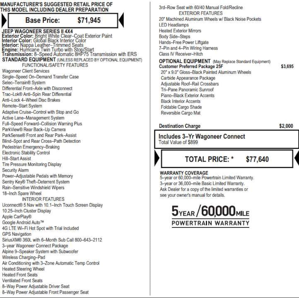 Service Work completed on this Jeep Wagoneer includes: Total Value: $568. Oil & Filter Change Using Original OEM Parts, Wheel/Tire Balance, Tires Rotated, 4 Wheel Alignment. Non-Smoker vehicle