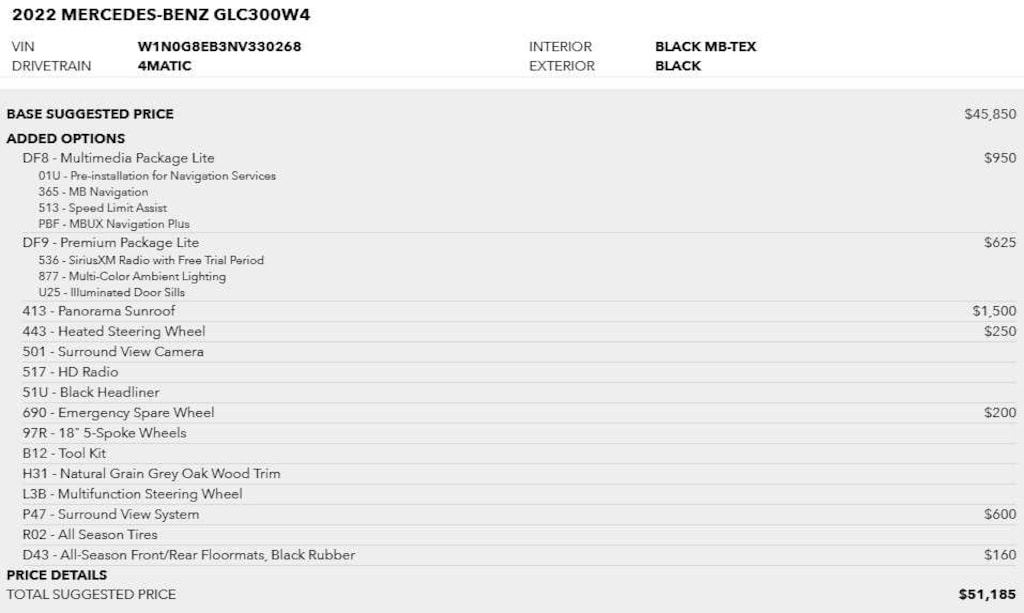 PANORAMA SUNROOF, MULTIMEDIA PACKAGE LITE Mercedes-Benz Navigation, Live Traffic, Navigation Services, Speed Limit Assist, PREMIUM PACKAGE LITE 64-Color Ambient Lighting, Illuminated Door Sills, SiriusXM Satellite Radio, SURROUND VIEW SYSTEM, HEATED STEERING WHEEL, EMERGENCY SPARE WHEEL.