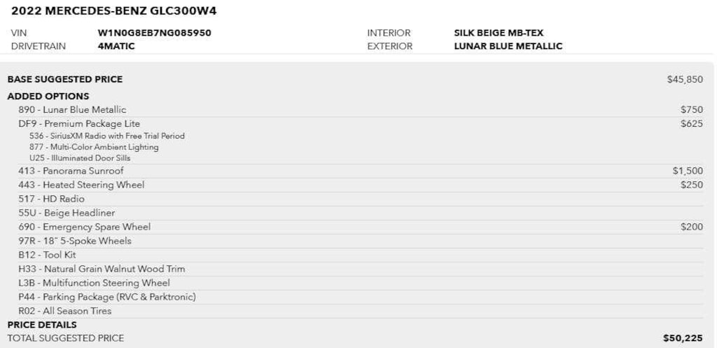 Full-Time 4MATIC® All-Wheel, Power Liftgate, Heated Driver Seat, Back-Up Camera, iPod/MP3 Input, Onboard Communications System, Aluminum Wheels, Remote Engine Start, Dual Zone A/C, Blind Spot Monitor, Smart Device Integration, Brake Actuated Limited Slip Differential, Heated Seats. Rear Spoiler, MP3 Player, Privacy Glass, Keyless Entry, Child Safety Locks. Mercedes-Benz GLC 300 with Lunar Blue Metallic exterior and Silk Beige/Black interior features a 4 Cylinder Engine with 255 HP at 5800 RPM*. CARFAX 1-Owner